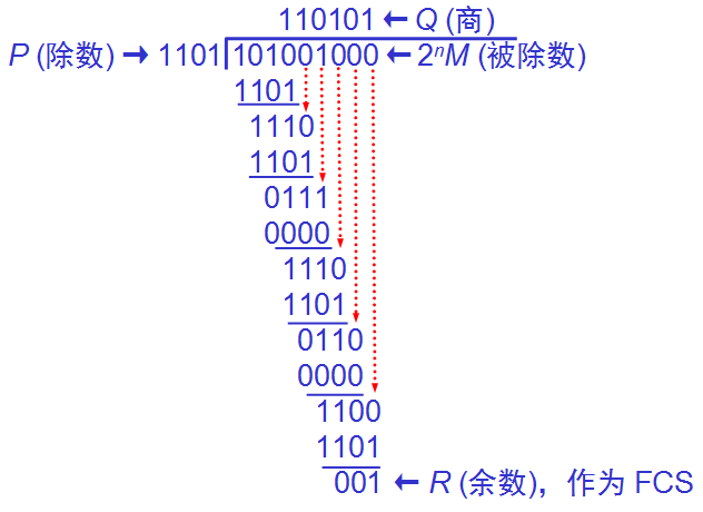用二进制的模 2 运算进行 2_n _乘 _M _的运算,这相当于在 _M _后面添加 _n _个 0。 得到的 (k + n) 位的数除以事先选定好的长度为 (n + 1) 位的除数 P,得出商是 _Q _而余数是 R,余数 _R _比除数 _P _少1 位,即 _R _是 n 位