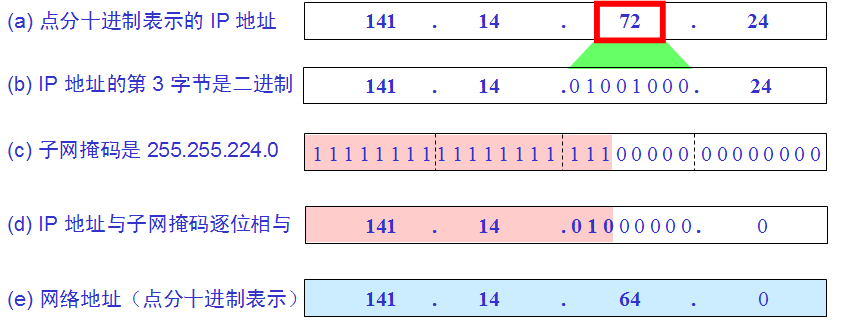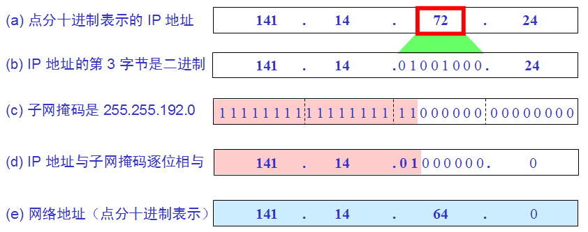 20、例子:已知 IP 地址是 141.14.72.24,子网掩码是 255.255.192.0。试求网络地址。