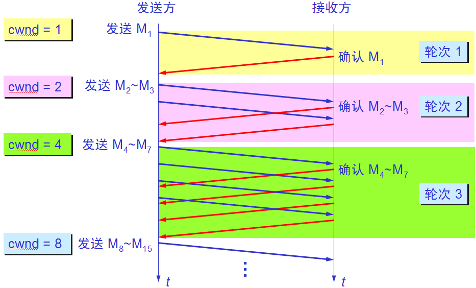 ②在每收到一个对新的报文段的确认后,将拥塞窗口加 1,即增加一个 MSS 的数值。