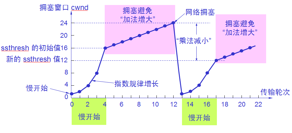 ②由于发送方现在认为网络很可能没有发生拥塞,因此现在不执行慢开始算法,即拥塞窗口 cwnd 现在不设置为 1,而是设置为慢开始门限 ssthresh 减半后的数值,然后开始执行拥塞避免算法(“加法增大”),使拥塞窗口缓慢地线性增大。